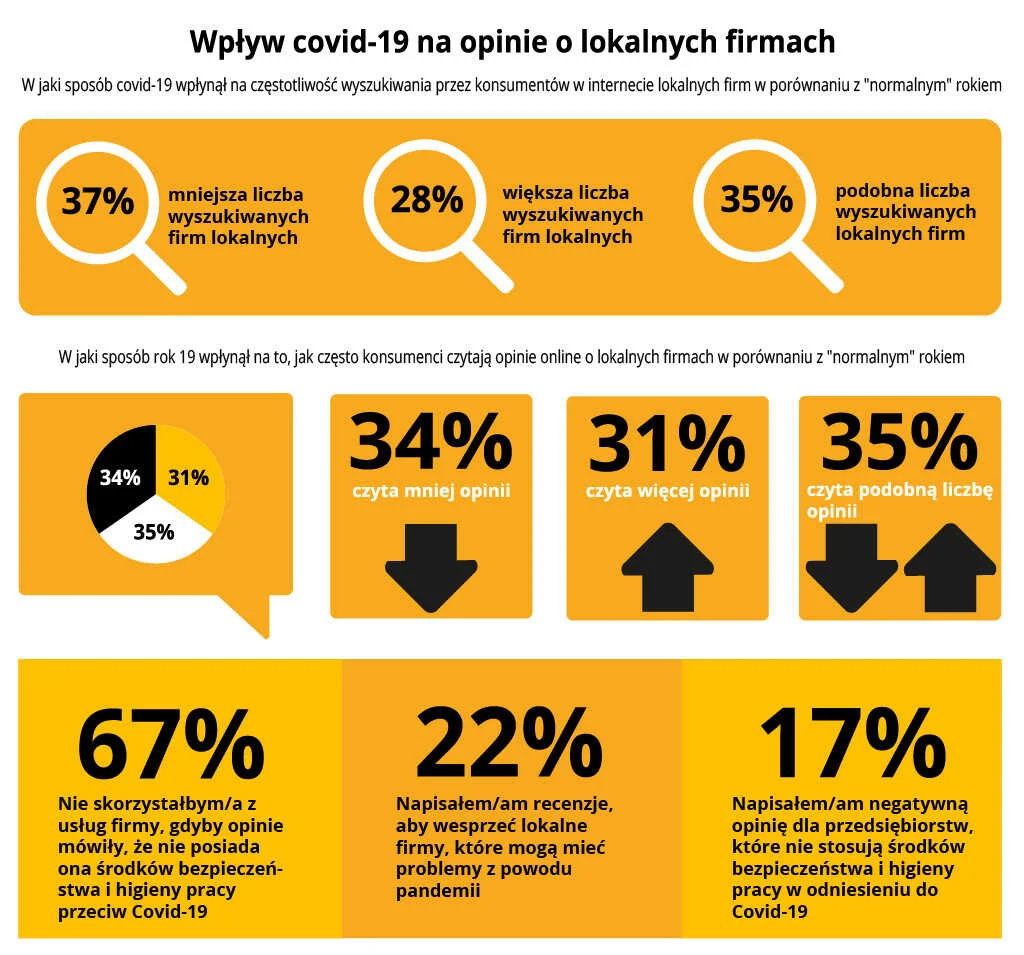 Według badań nie ma określonych wyników, które wskazywałyby jasno, jak pandemia wpłynęła na zachowania klientów, ponieważ jest to zależne chociażby od branży, miasta i wielu innych czynników. Około 37% osób szukało zdecydowanie mniej lokalnych firm w Internecie, a prawdopodobnie było to na obszarach, w których wiele firm musiało zostać zamkniętych.