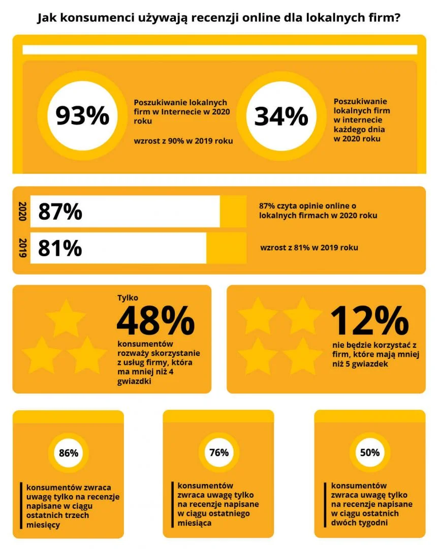 - W 2020 roku 87% konsumentów czytało recenzje lokalnych firm przed skorzystaniem z usług. To wzrost o 81% w porównaniu do 2019 roku.