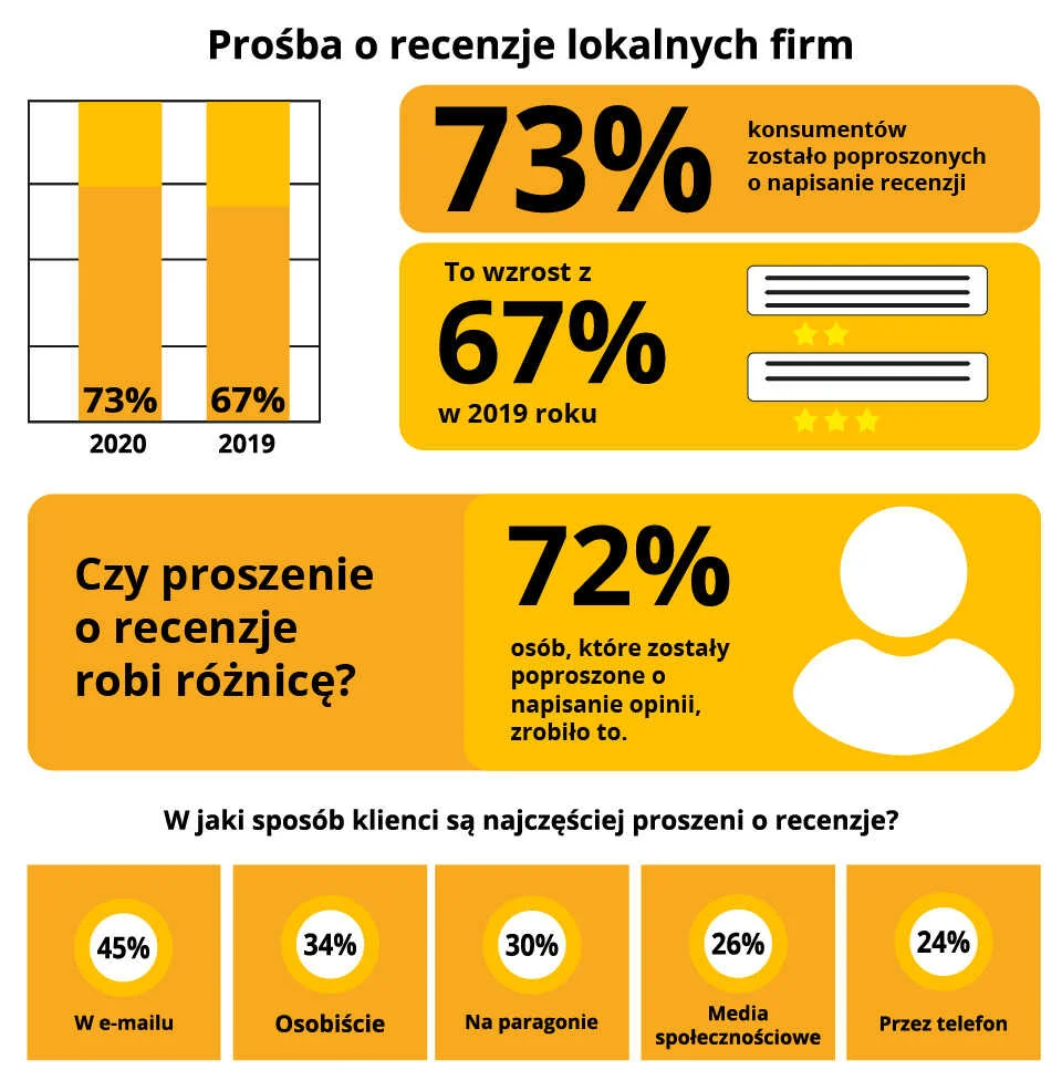 Według ankiety, 73% konsumentów poproszono o udzielenie opinii dla lokalnej firmy – w porównaniu z 67% w 2019 r. I 68% w 2018 roku – co pokazuje wzrost liczby właścicieli firm proszących o informacje zwrotne.