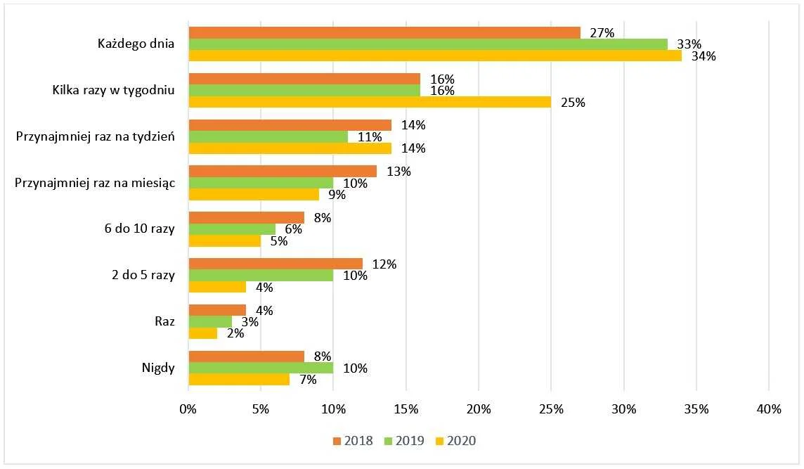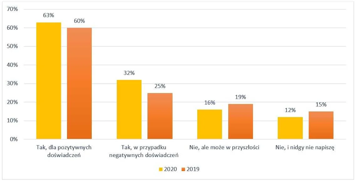 63% osób twierdzi, że napisało opinię z pozytywnym doświadczeniem, w porównaniu z 60% w zeszłym roku. Największy wzrost odnotowano wśród osób, które napisały negatywną opinię – z 25% w 2019 roku do 32% w 2020. Być może jest to spowodowane sytuacją z Covid-19 oraz funkcjonowaniem firm w tym trudnym dla nich czasie.