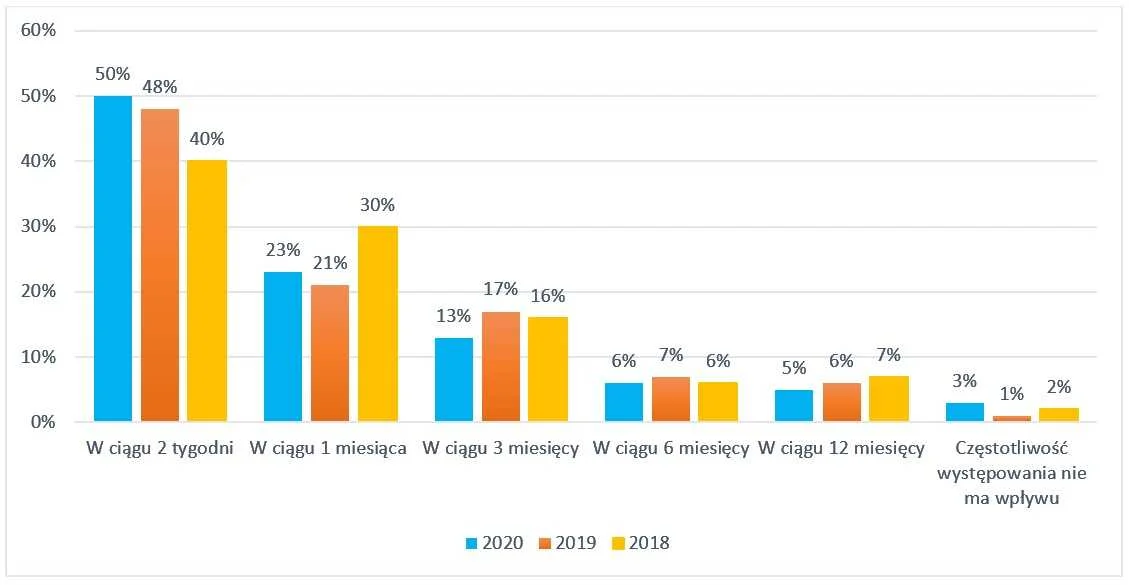 86% konsumentów twierdzi, że szczególną uwagę zwraca głównie na opinie z ostatnich 3 miesięcy, a 73% twierdzi, że recenzje klientów muszą pochodzić z ostatniego miesiąca, aby miały wpływ na wybór, czy skorzystać z usług firmy. W ostatnim roku było to 69% osób.