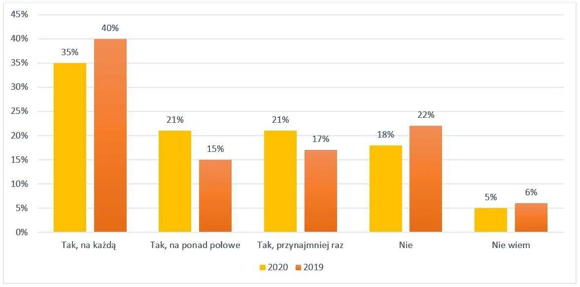 Natomiast znacznie mniej osób otrzymało odpowiedź na KAŻDĄ recenzję – 35% w porównaniu z 40% z roku 2019. Dlatego każda firma powinna stale monitorować opinie i odpowiadać na jak największą ilość.