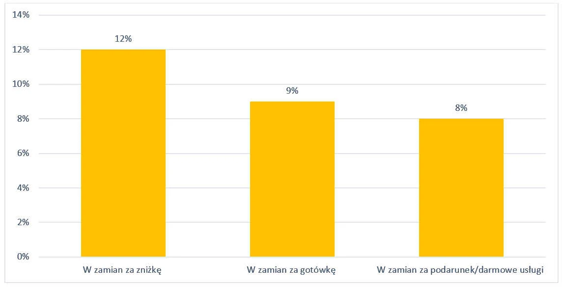 Zapytaliśmy respondentów, czy w zamian za napisanie opinii zaproponowano im np. rabat – 12% odpowiedziało twierdząco, 9% za gotówkę, a 8% za prezent lub bezpłatną usługę. Często jest to sprzeczne z wytycznymi wielu witryn do wystawiania recenzji, ale działa.
