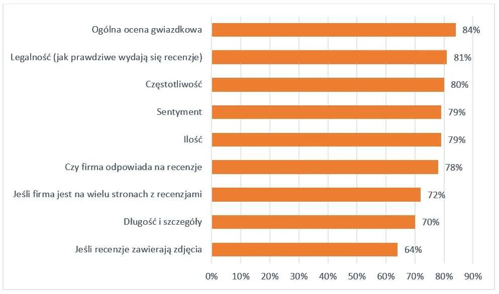 - W 2020 roku ogólna liczba gwiazdek firmy była głównym czynnikiem, jaki miał największy wpływ na wybór konsumentów. Na drugim miejscu znajduje się wiarygodność recenzji. W związku z tym, że fałszywe recenzje od lat pojawiają się na wielu portalach i nie tylko, klienci zwracają również na to uwagę.