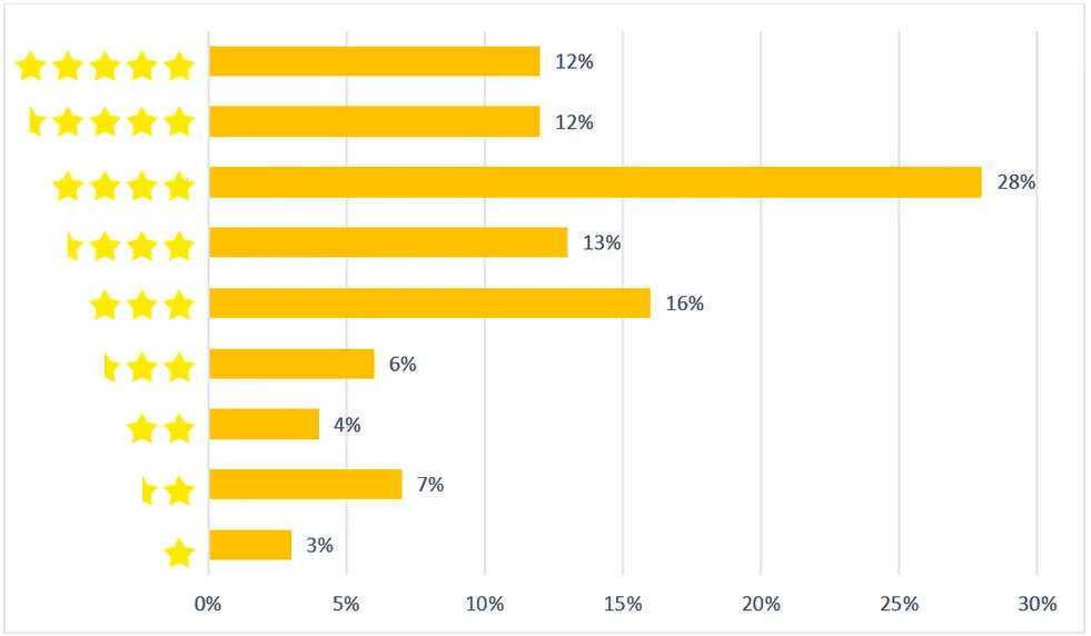 Wiemy, że w oczach klientów istnieje spora różnica między oceną 4, a 5 gwiazdek. Z tego powodu dostępne są obecnie również oceny na pół gwiazdki, by lepiej dopasować do oczekiwań konsumentów. Jak wskazują badania, tylko 12% konsumentów będzie korzystać z firm z oceną 5 gwiazdek.