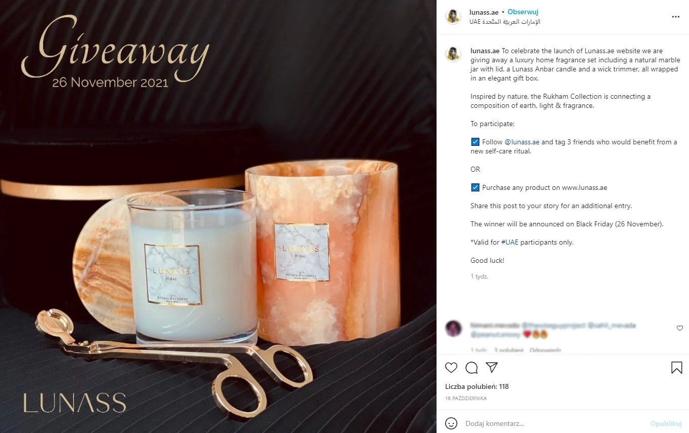 Zbliżający się Czarny Piątek to także doskonała okazja do zorganizowania konkursu. Dzięki takiej akcji promocyjnej zainteresujesz potencjalnych klientów swoją ofertą i zwiększysz ruch organiczny na Twoim sklepie internetowym. Sam konkurs nie musi być bardzo skomplikowany. Z tym zadaniem świetnie poradziła sobie marka Lunass. Aby wygrać ich ekskluzywne świeczki wystarczy: