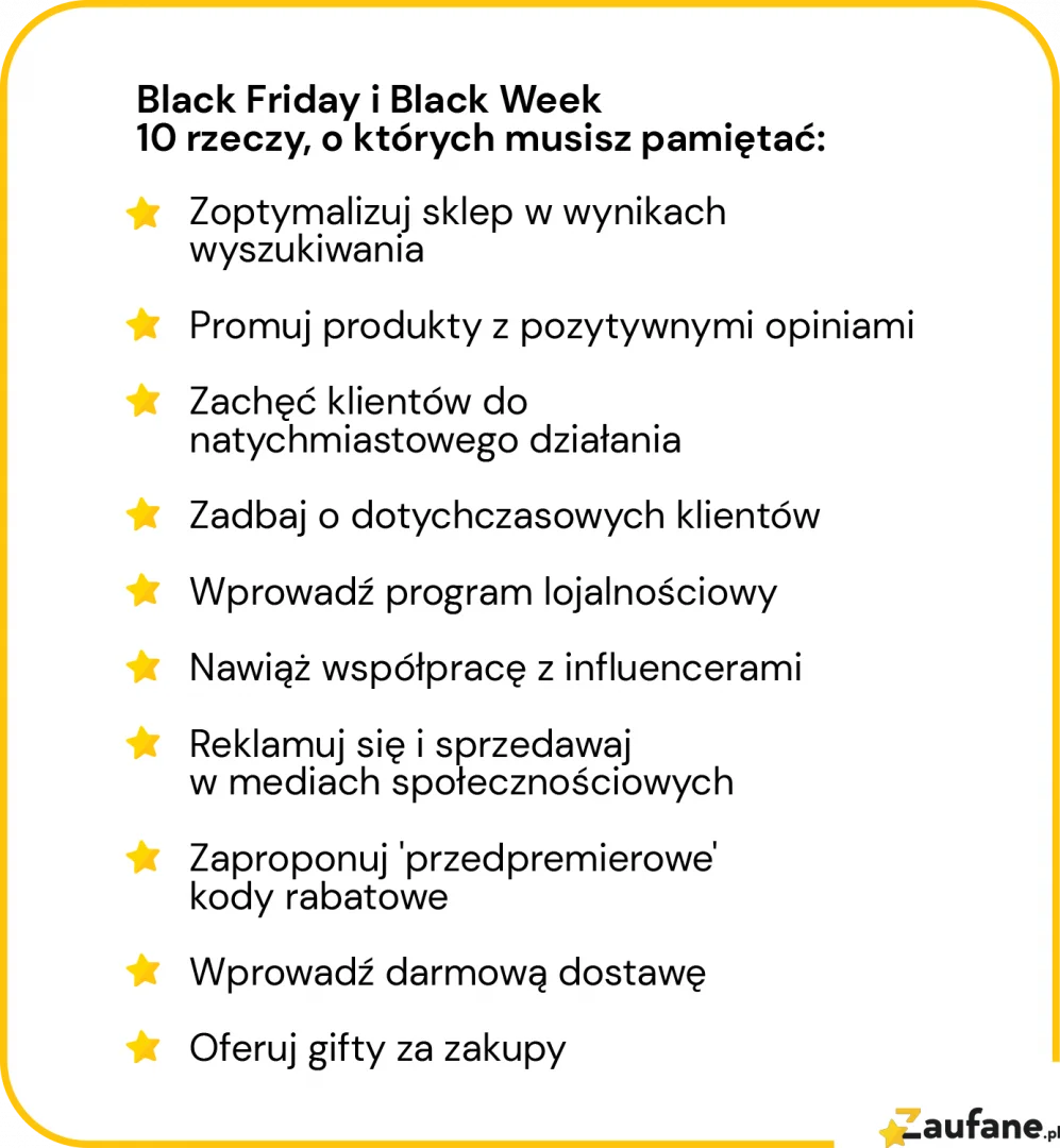Black Friday to święto zakupów i sklepów internetowych, podczas którego obowiązkowo trzeba przeprowadzić kampanię marketingową. Dzięki niej możesz spodziewać się zysków nie tylko na koncie. Czarny Piątek i zwiększona ilość zakupów jest doskonałym sposobem na zdobycie autentycznych i pozytywnych opinii. Warto usprawnić ten proces z Zaufane.pl, aby żadna z nich nie przeszła Ci obok nosa. Wykorzystaj do tego swoją kampanię reklamową na Black Friday!