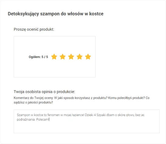 Marka 4 Szpaki korzysta z pogłębiającej ankiety produktowej, w której klient wystawia opinie dotyczącą zakupionych kosmetyków. Rozwiązanie to jest doskonałym źródłem informacji o produktach, ich jakości i praktycznym zastosowaniu.