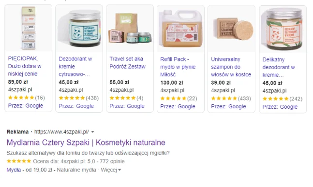 Obecność gwiazdek w reklamach Google zwiększa liczbę ich kliknięć. Jest to doskonały sposób na wzrost efektywności prowadzonych kampanii. Mydlarnia 4 Szpaki z powodzeniem wykorzystuje tę funkcjonalność w swoich reklamach płatnych.