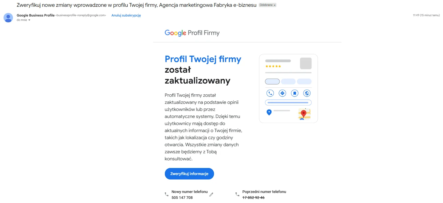 Jeśli nie zmieniłeś podstawowej konfiguracji wizytówki Google, informacje o aktualizacjach informacji otrzymasz bezpośrednio na swoją skrzynkę mailową.