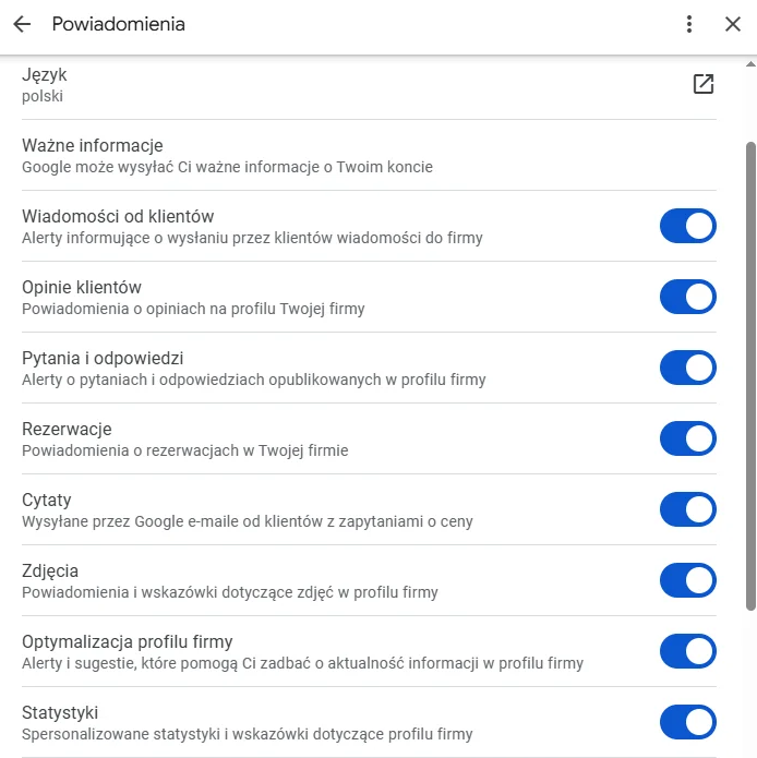- Powiadomienia o zmianach w wizytówce Google