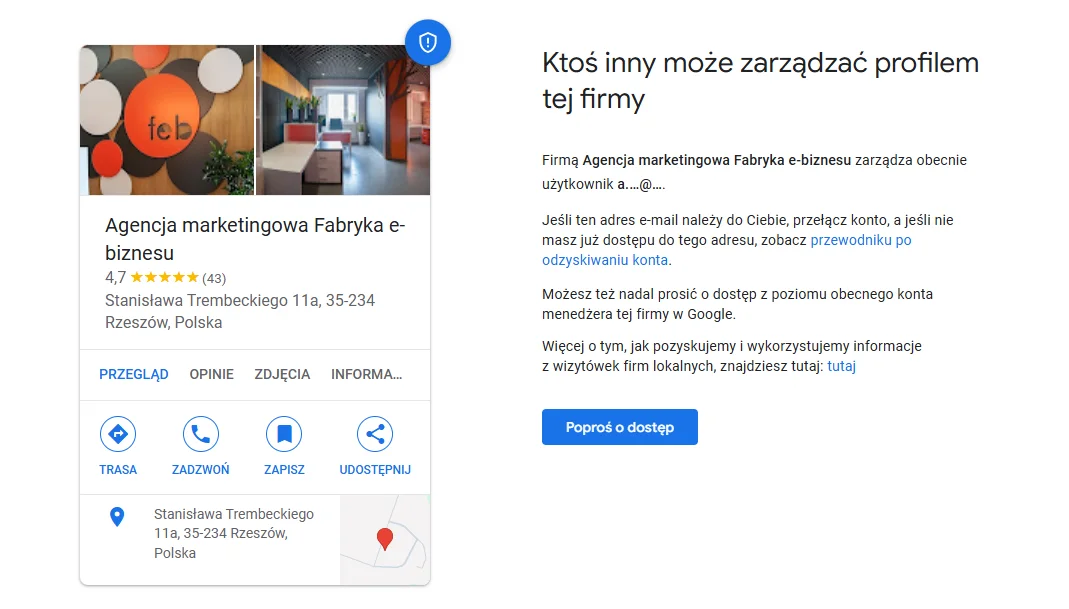 Zobaczysz komunikat informujący, że ktoś inny zarządza tym profilem, zawierający częściowo ukryty adres e-mail właściciela. Kliknij przycisk "Poproś o dostęp" i wypełnij krótki formularz, w którym określasz swój poziom uprawnień (najlepiej wybierz "Właściciel") oraz związek z firmą.