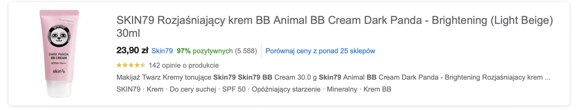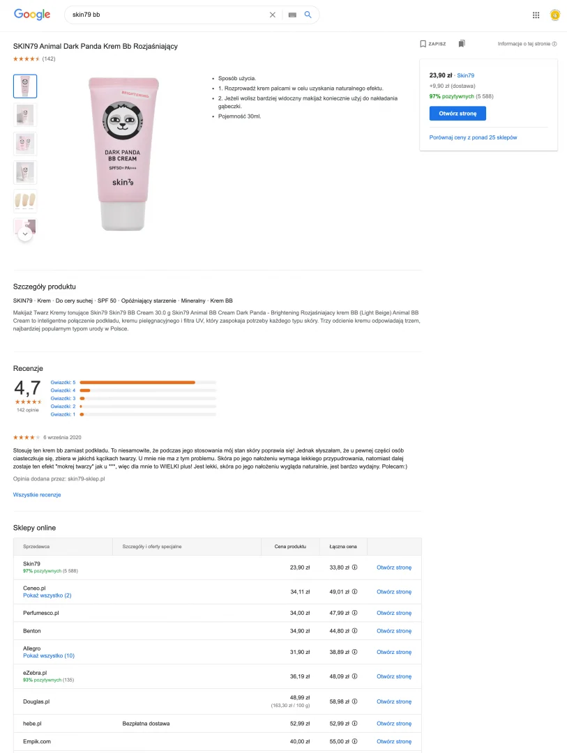 Zobaczysz zestawienie wszystkich opinii zebranych we wszystkich sklepach i platformach sprzedażowych dla tego konkretnego produktu. Poszczególne opinie i oceny z powrotem przenoszą do oryginalnej firmy, która zebrała i zaindeksowała recenzje. To bardzo ważne, ponieważ po przeczytaniu recenzji użytkownicy wracają na Twoją stronę, gdzie mogą zakupić wysoko oceniany przedmiot.