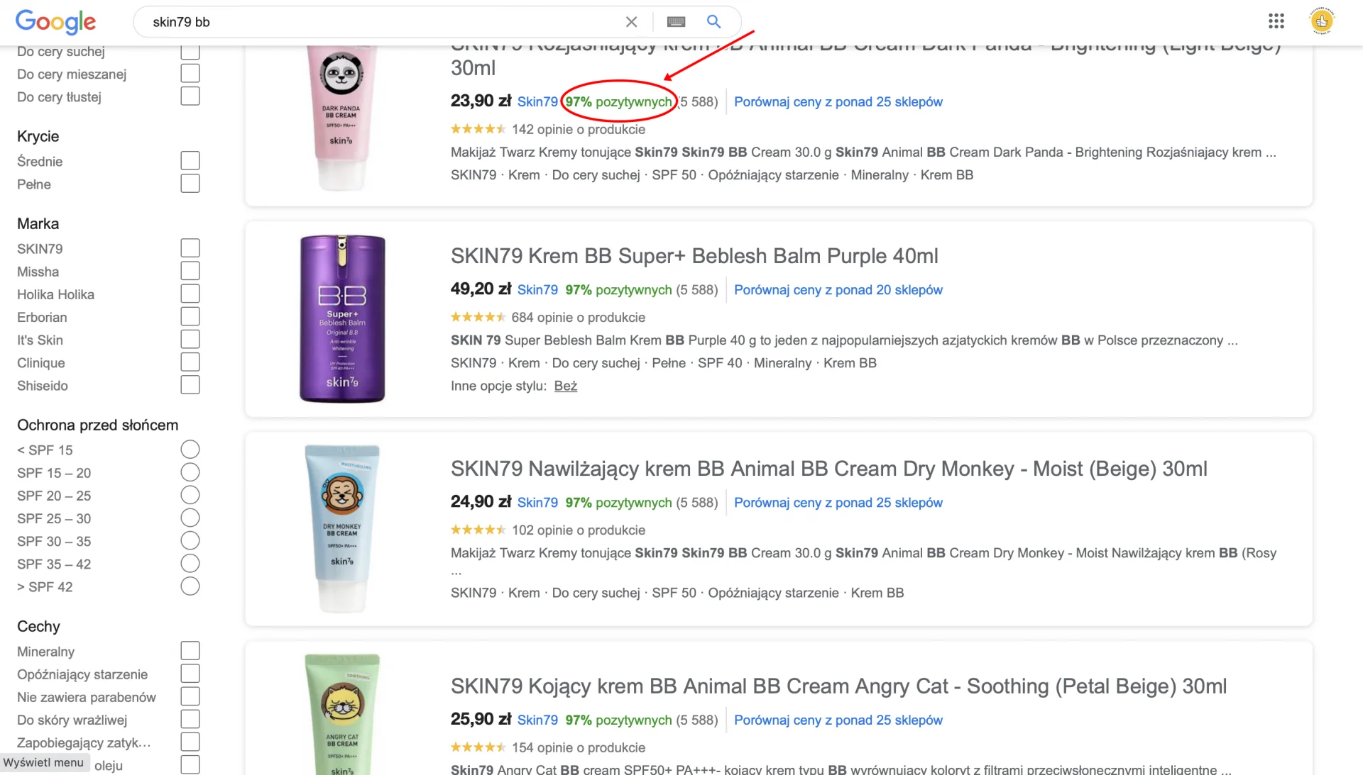 Jest to zrzut ekranu wyników Zakupów Google dla kosmetyków. Produkty z gwiazdkami pod spodem naturalnie wyróżniają się bardziej niż te, które nie mają gwiazdek. W momencie, gdy klikniesz w liczbę recenzji wyświetlanych tuż obok gwiazdek zostaniesz przeniesiony na inną stronę – taką, jak poniżej.