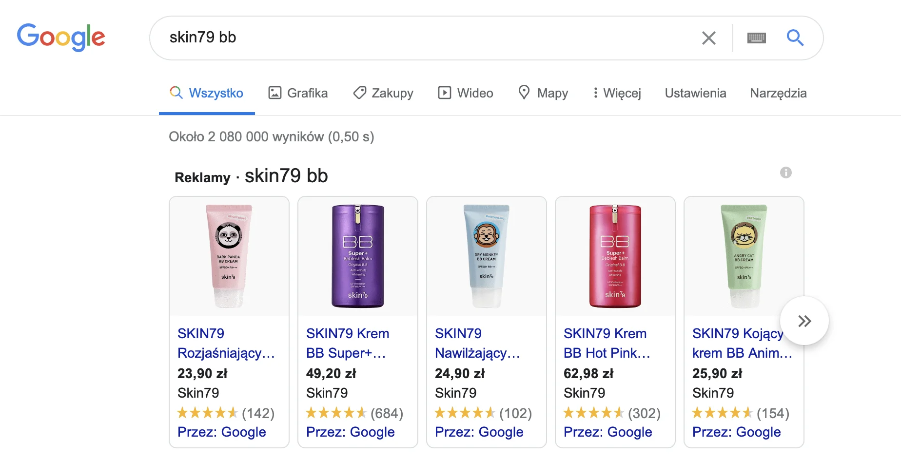 Jak widzisz w jednym miejscu wyświetlane są takie same lub podobne produkty od kilku reklamodawców, dzięki czemu zanim użytkownik zacznie wyszukiwać ich w tradycyjnych wynikach, najpierw zobaczy zdjęcia produktów, które - powiedzmy sobie szczerze - skutecznie przyciągną jego uwagę.