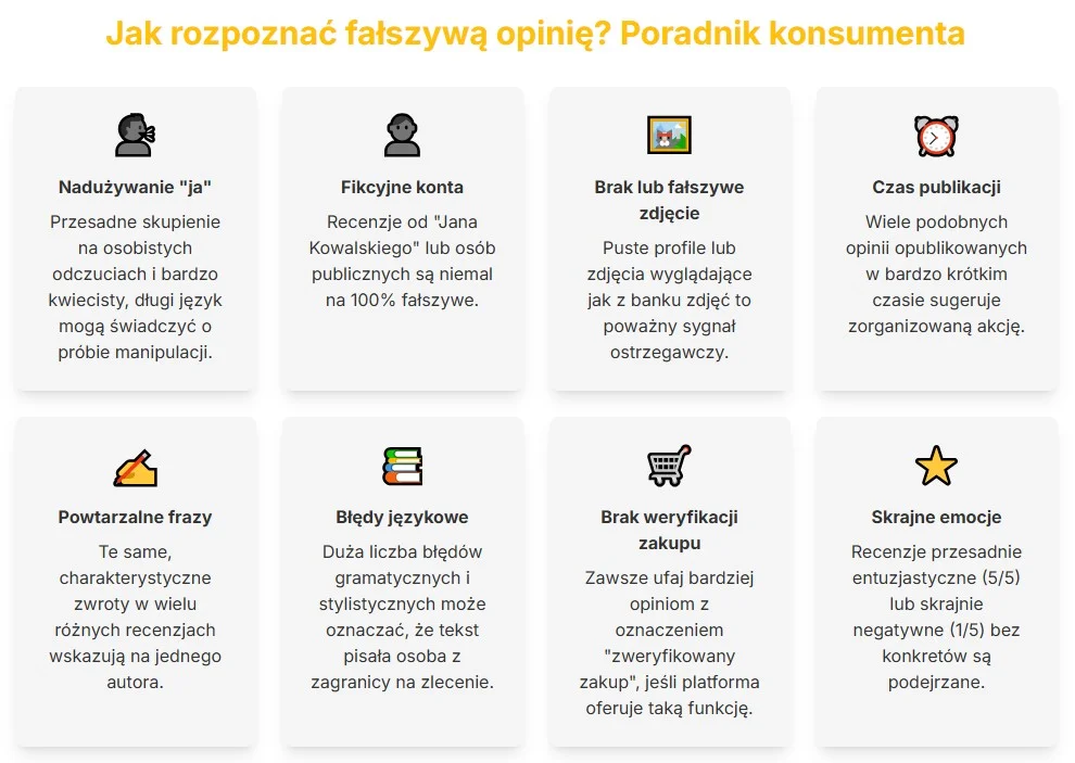 - Istnieją metody rozpoznawania fałszywych recenzji – warto zwrócić uwagę na powtarzające się frazy, błędy językowe, brak zdjęcia lub fikcyjne profile, a także na podejrzanie nagły przyrost opinii.