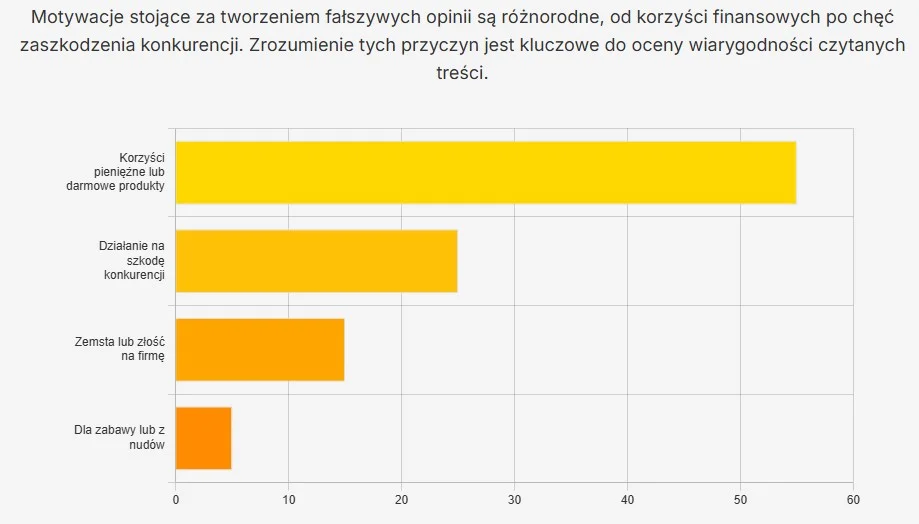 - Powody powstawania fałszywych opinii są różne – od zarobkowych (płatne recenzje), przez działania konkurencji, po osobistą zemstę lub zwykłą zabawę.