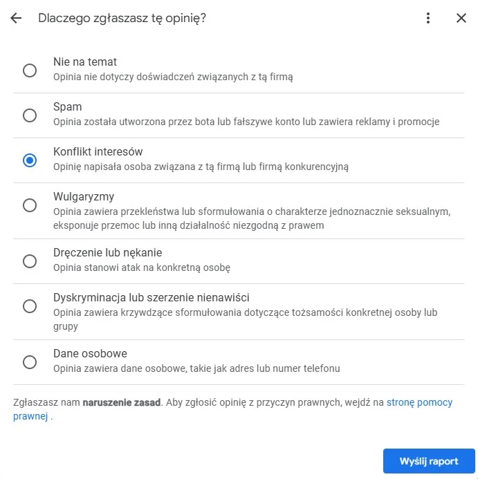Jeżeli masz pewność, że dana opinia nie powinna znaleźć się przy Twojej wizytówce, możesz zgłosić ją bezpośrednio z panelu zarządzania profilem w Google.