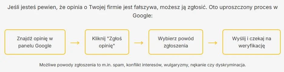 - Możesz zgłosić fałszywą opinię do Google – w panelu zarządzania wizytówką kliknij ikonę wykrzyknika, wybierz powód zgłoszenia (np. spam, konflikt interesów, dane osobowe) i poczekaj na decyzję Google.