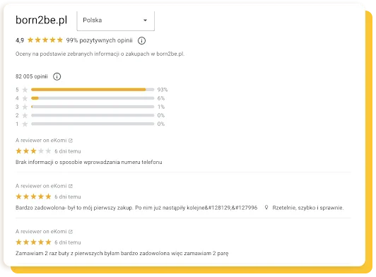 Nawet jeśli masz kilka negatywnych recenzji, fakt, że potencjalni klienci mogą łatwo uzyskać dostęp do prawdziwych opinii innych użytkowników na temat Twojej firmy zdecydowanie pomoże w podjęciu decyzji o zakupie.