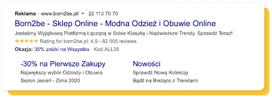 Klikając słowo “Rating” obok gwiazdek zostaniesz przeniesiony ponownie do podziału opinii, dzięki czemu potencjalni klienci, którzy jeszcze nie są na 100% przekonani mogą uzyskać dodatkowe informacje o firmie, zanim zdecydują się kliknąć w reklamę.)
