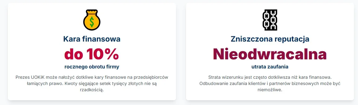 Kary finansowe są dotkliwe – przedsiębiorcy mogą zapłacić do 10% rocznego obrotu, a dodatkowo narażają się na kontrolę i publiczne nagłośnienie sprawy.