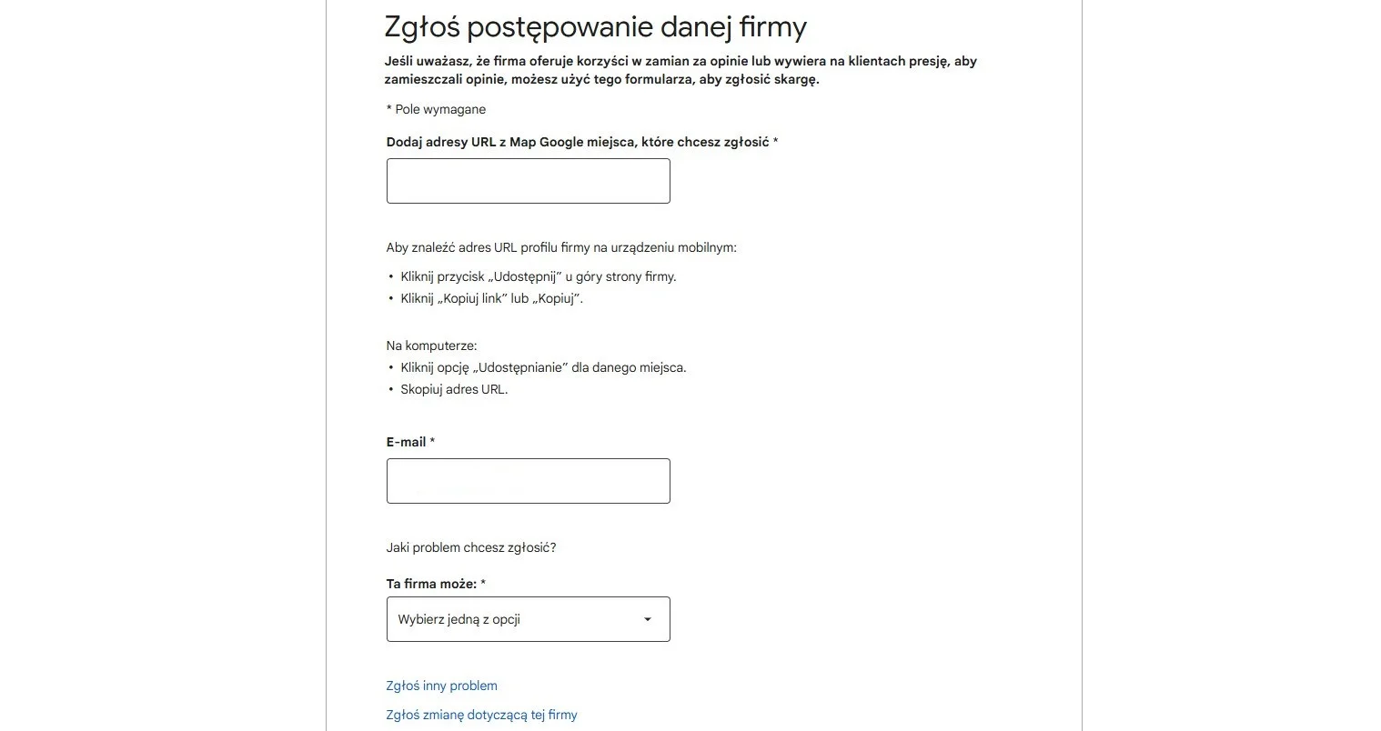 Formularz "Zgłoś postępowanie danej firmy" pozwala poinformować Google o działaniach takich jak oferowanie nagród w zamian za pozytywne recenzje czy wywieranie presji na klientach, aby wystawiali opinie.