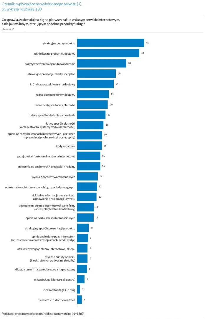 Istotną część raportu stanowi dział poświęcony wyborom klientów, który pozwala zrozumieć, jakie kwestie są dla nich kluczowe w procesie e-zakupów Okazuje się, że dokonując wyboru miejsca zakupu w sieci kierują się oni głównie trzema czynnikami – atrakcyjną ceną produktu (45% badanych), niskimi kosztami dostawy (42%) oraz pozytywnymi doświadczeniami z przeszłości (33%).