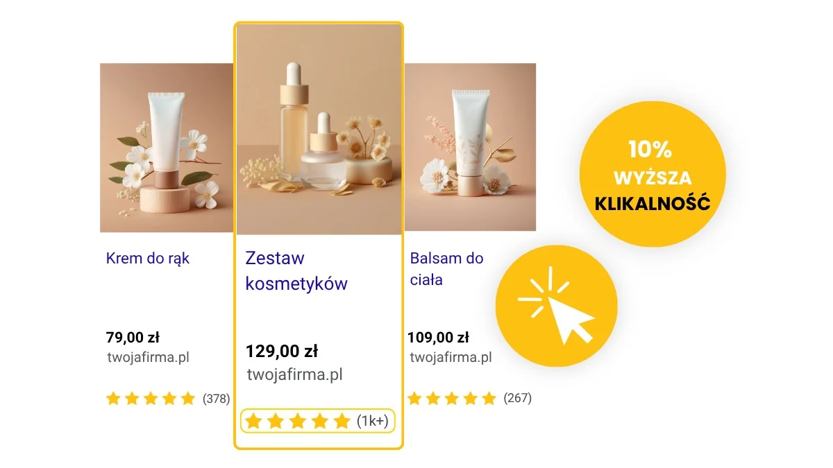 Mimo to warto o nie zadbać, bo produkty z dobrą oceną wyróżniają się na tle innych – jak pokazuje praktyka e-commerce, wyróżnienie ofert gwiazdkami zwiększa współczynnik klikalności i sprzedaż, a nawet może obniżyć koszt kliknięcia dzięki wyższej jakości reklamy.