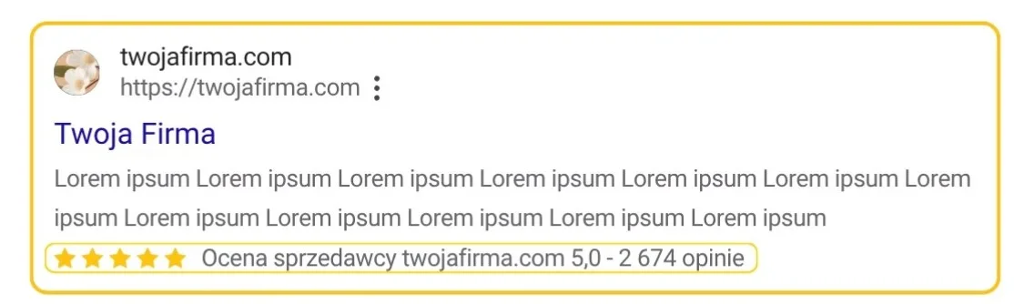W kontekście SEO to bardzo pożądane zjawisko. Warto jednak podkreślić – gwiazdki rich snippets nie pochodzą z opinii Google (takich jak Moja Firma czy opinie konsumenckie), lecz z Twojej własnej strony internetowej. Aby się pojawiły, musisz wdrożyć w kodzie strony odpowiednie dane strukturalne (schema markup) dla recenzji.