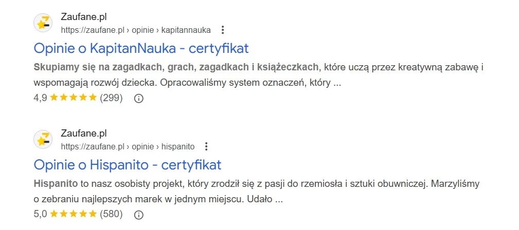 Rich snippets z opiniami traktujemy jako osobny typ “opinii w Google”, ponieważ wizualnie pełnią podobną rolę – pokazują gwiazdki i oceny – choć źródło tych ocen jest poza Google. Dla użytkownika jednak nie ma to większego znaczenia – liczy się, że widzi wysoką ocenę przy wyniku wyszukiwania.
