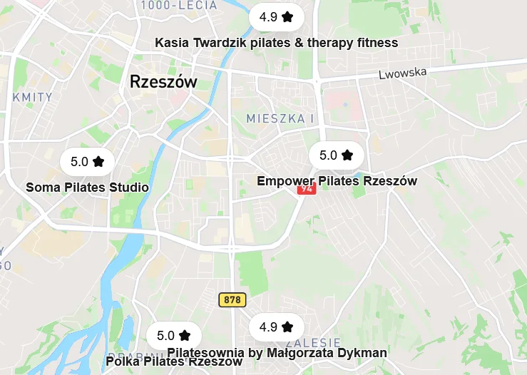 - Najwyżej oceniane studia w Rzeszowie to: Pilatesownia by Małgorzata Dykman, Polka Pilates Rzeszów, Empower Pilates Rzeszów, Kasia Twardzik – Pilates & Therapy Fitness, Soma Pilates Studio.