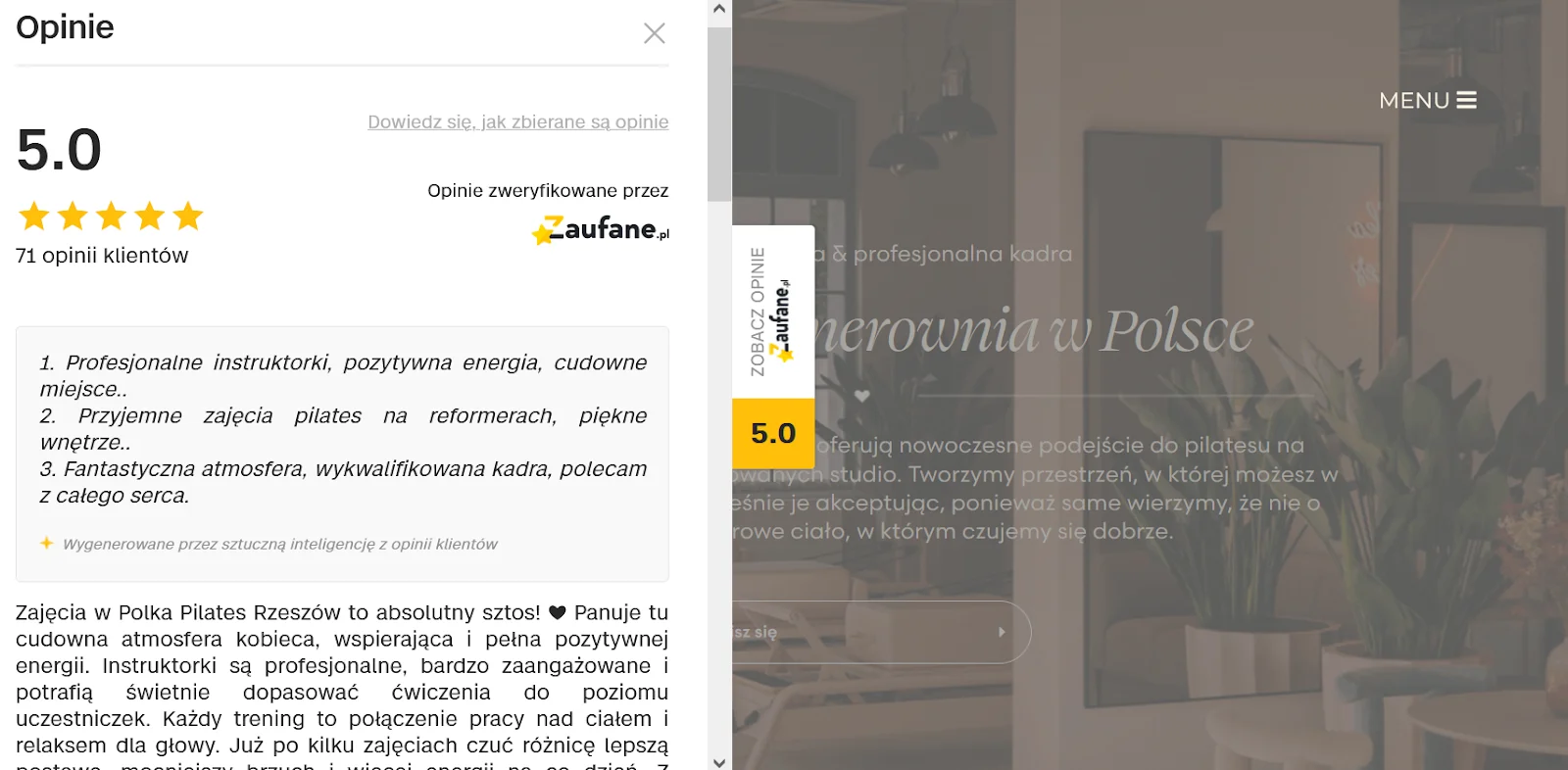 Polka pilates dzięki aktywnemu pozyskiwaniu feedbacku zebrali od początku współpracy z Zaufane.pl, 47 pozytywnych opinii. Ponadto na wizytówce Google posiadają średnią ocenę 5.0. Dodatkową wiarygodność budują za pomocą widgetu na własnej stronie internetowej, dzięki temu potencjalni klienci mogą przeczytać o doświadczeniach innych i łatwiej podjąć decyzję o wyborze miejsca do ćwiczeń.
