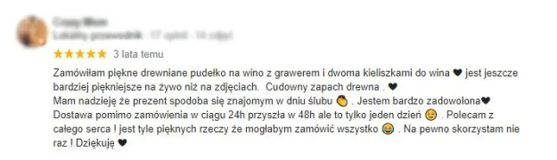 Nieco inaczej ma się jednak sprawa z pozytywnymi opiniami 5-gwiazdkowymi. W takim przypadku warto podkreślić i docenić ten fakt. Twój klient nie tylko poczuje się wyjątkowo, ale również będzie motorem napędowym dla innych - dzięki Twojej odpowiedzi każdy będzie chciał poczuć się tak, jak on.