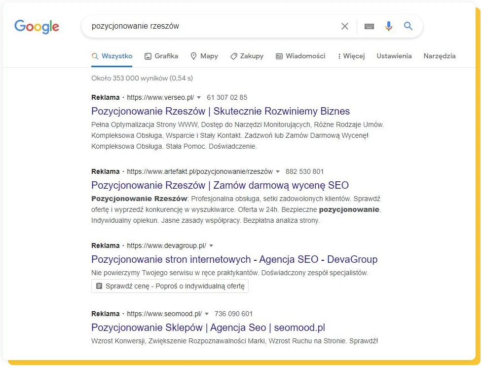 Podobnie jak w przypadku bezpłatnych wyników wyszukiwania wyświetlanie gwiazdek w reklamach sprawia, że są bardziej widoczne – jako pierwsze przyciągają uwagę użytkownika. Jeśli Twoja konkurencja pojawia się w dziale z reklamami i posiada w swoich ofertach gwiazdki – w Twoim przypadku również jest to element obowiązkowy.