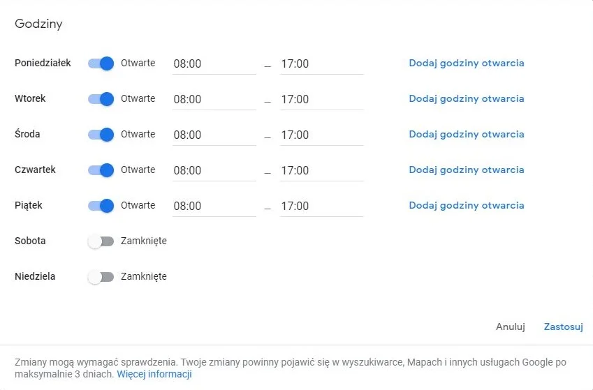 Niestandardowe godziny otwarcia w wizytówce Google Moja Firma