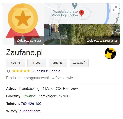 Mapy Google wyświetlają także godziny, kiedy dana firma jest otwarta, a kiedy zamknięta. Ważne jest zatem, abyś jako właściciel wizytówki Google Moja Firma podał godziny pracy. Oczywiście brzmi to dość banalnie, ale istnieje całe mnóstwo profili firm bez tych istotnych informacji.