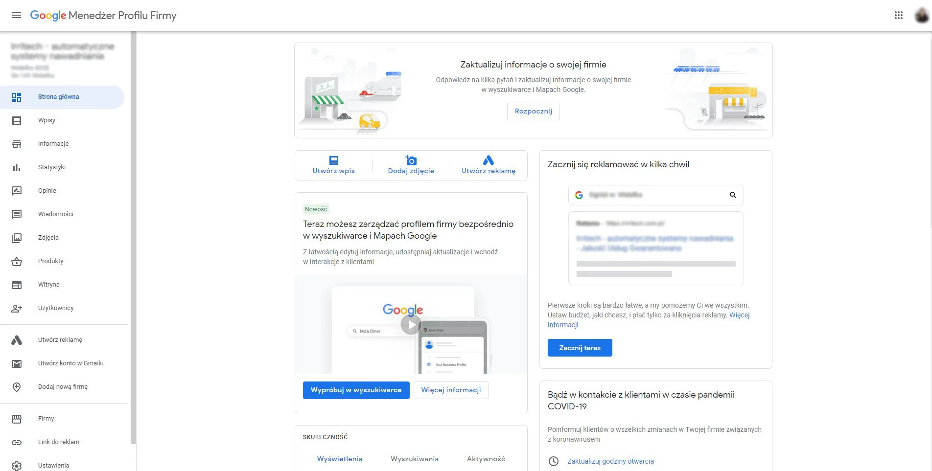 Aby móc zacząć optymalizację na samym początku musisz utworzyć profil swojej firmy w Google lub zgłosić do niego prawa w panelu Google Moja Firma. Kliknij "Zarządzaj" i zaloguj się do swojego konta w wizytówce Google. Jeśli już posiadasz prawa do profilu firmy w Google, to ujrzysz przed sobą panel zarządzania.