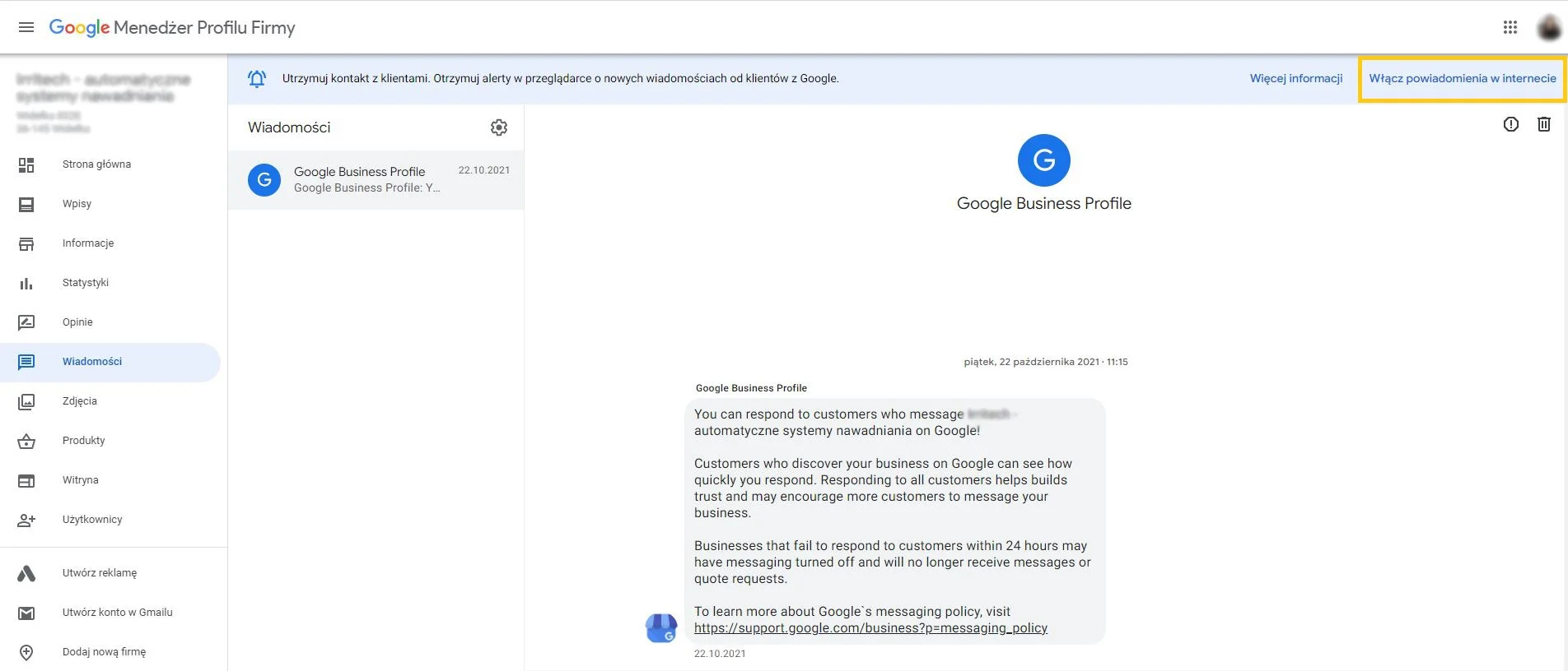 Włączenie powiadomień o pytaniach klientów w wizytówce Google Moja Firma