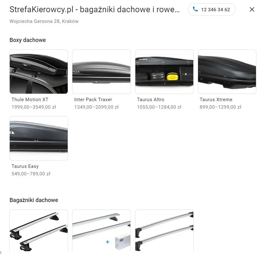 Przykładem jest firma naszego klienta, który w swojej wizytówce zamieścił oferowane przez siebie produkty.
