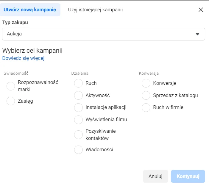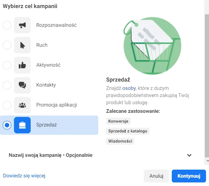Pierwszym wartym uwagi aspektem są nowe cele kampanii reklamowych, a dokładnie zmniejszenie ich ilości z 11 do 6-ciu. Cele kampanii, które są aktywne obecnie to: rozpoznawalność, ruch, aktywność, kontakty, promocja aplikacji i sprzedaż. Wcześniej cele były podzielone na 3 grupy: świadomość, działanie, konwersje, a te z kolei na podgrupy, którymi doprecyzowaliśmy kampanie.