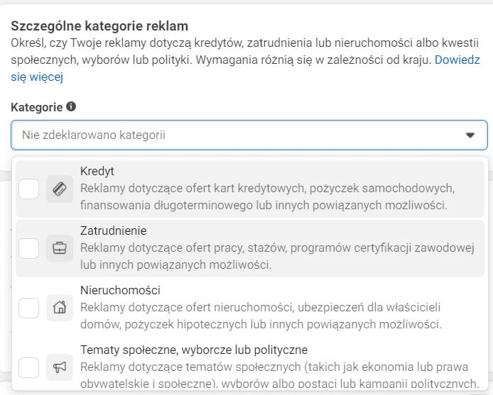 W kampaniach, które zostały utworzone do grudnia 2021 obowiązują jeszcze precyzyjne targetowania — niemniej te zestawy reklam mogą być automatycznie wstrzymywane przez system. Szczególnie gdy zostają wprowadzane istotne zmiany w zestawie reklamowym i samej reklamie. Od początku roku 2022 na fanpagach powiązanych ze szczególnymi kategoriami zmienił się sposób tworzenia kampanii. Pierwszą różnicą, jaką napotkamy, tworząc kampanię, będzie prośba o określenie kategorii, w jakiej tworzymy reklamę.