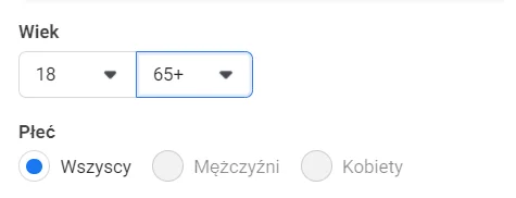 Kolejne różnice napotykamy przy określaniu grupy odbiorców. Chcąc ustawić lokalizację z wykorzystaniem adresu lub pinezki możemy to zrobić tylko z zaznaczeniem min. 15 km promienia. Wcześniej promień był dużo mniejszy, gdyż zaczynał się już od 2 km. Idąc dalej, zarówno wiek, jak i płeć odbiorców nie podlega żadnym dookreśleniom. Automatycznie zostaje narzucony wiek 18-65+ oraz kierowanie do obu płci w tym samym zestawie reklam.
